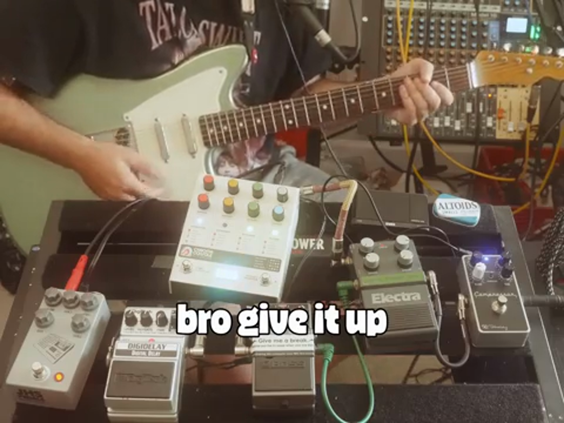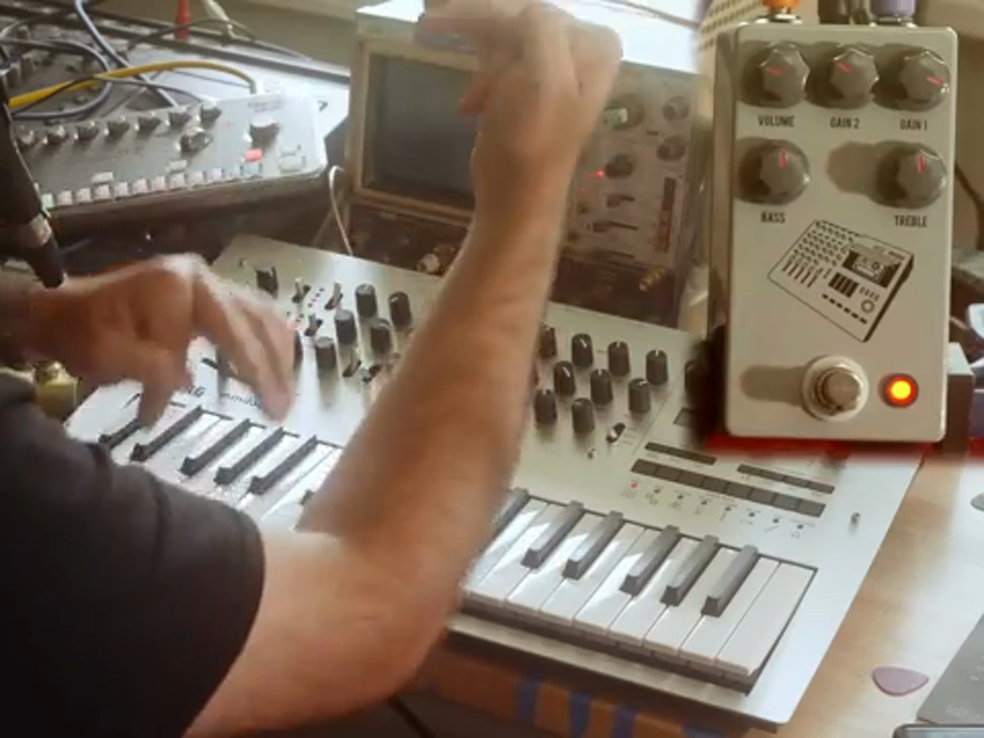 Jorb kicks things up by pairing the 424 Gainstage with the Korg Minilogue, shooting for a sound that’s gritty and full. “No disrespect, my darling,” he teases the Minilogue, referring to its not-so-beefy stature. Then, in rolls the Strymon Volante and eventually the TT-78, a CR-78 clone. These elements dance on top of the Tascam 424, which lends its vintage charm. The controls on the pedal mimic classic Tascam mixers, adding character and warmth to the sound. Gain 1, the channel trim, and EQ all give you a taste of vintage crackle. The possibilities with this pedal are sky-high, and Jorb makes sure you see the potential across all types of tunes—not just guitar. As the oscilloscope dances, you feel yourself being swept up in a world where synth waves and old-school vibes make beautiful music together.